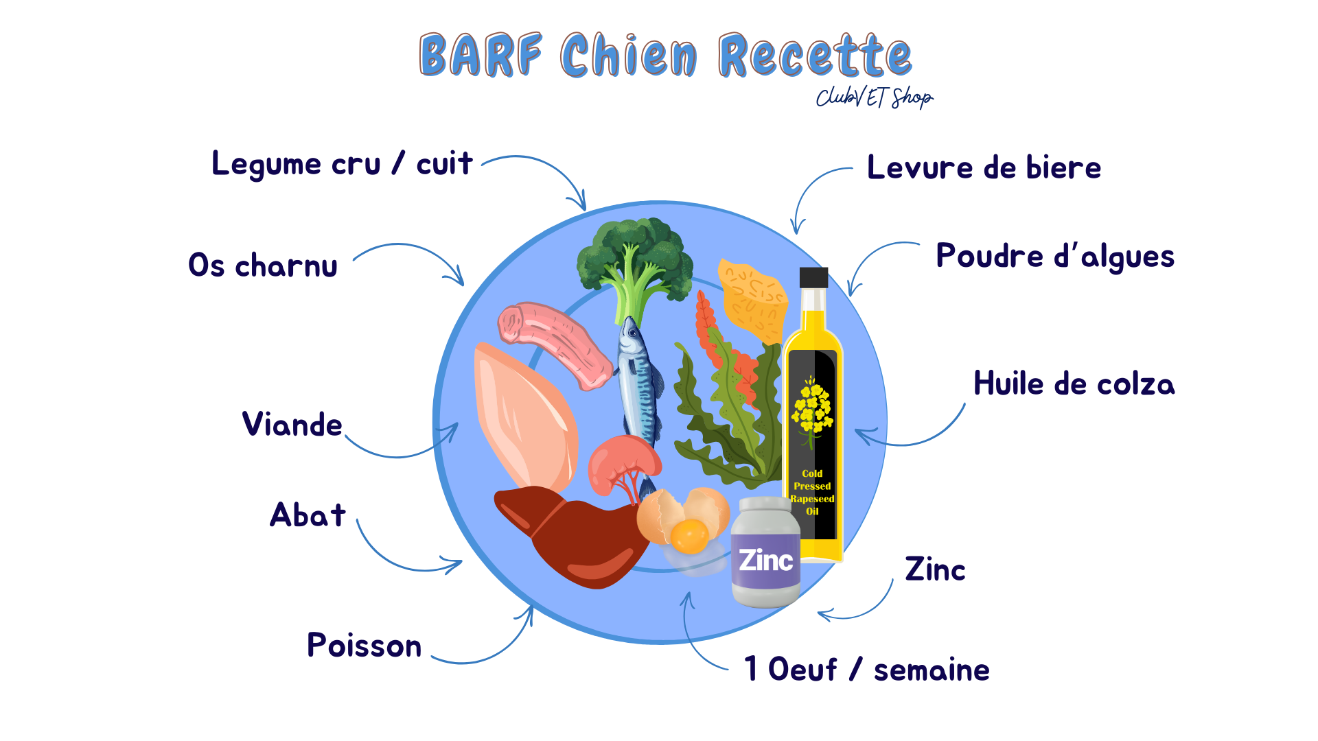 Une recette type BARF comprend une base crue de viande et/ou de poisson, des abats, des os charnus, des œufs, des légumes, de l'huile et des compléments.